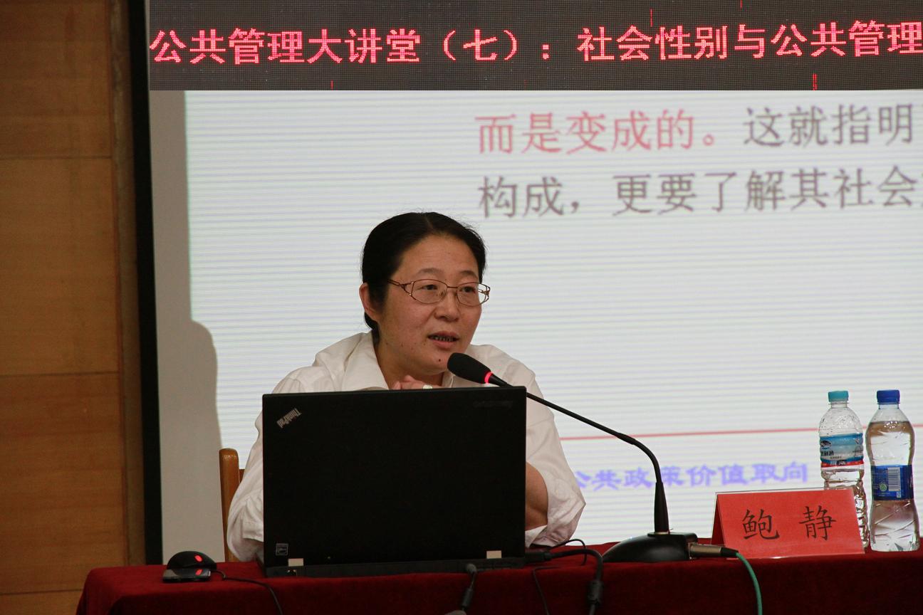 讲座紧紧围绕“社会性别”和“公共管理”两个主题渐进展开。鲍静教授首先系统地介绍了社会性别理论的基本内涵、形成机制及其主流化趋势与学术价值。然后,重点分析了社会性别理论与公共管理间的关系;作为一种社会建构理论,社会性别具有后天性、可更改性、相对稳定性、历史阶段性、社会性和共塑性等特性;社会性别理论则重点关注“男女平等与性别压力”、“男女两性的社会性别差异”等问题。鲍静认为,男女平等不是一味的强调女权,而是要使男性和女性都承担一定的“社会角色”和“家庭角色”,做到双方的真正平等。最后,对如何理解和寻求社会性别公平、如何理解社会性别视角下公共管理的价值取向等问题阐述了自己的见解,并强调指出,“推动社会性别平等是国家责任”的信念已成为世界各国政府和学术界的共识。公共管理中社会性别意识的缺失是对现实中性别歧视行为的放纵,又进而加固了社会性别的不平等。目前公共管理中所凸显出的社会性别意识正是关注处于劣势地位的女性利益、实现社会公正的重要途径。