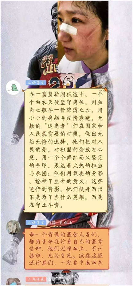2019级公共管理类2班团支部致敬“最美逆行者”,在班级QQ群中分享多名90后医护人员的工作视频,他们厚重的防护服、脸上护目镜的深刻痕迹,给同学们留下了深刻印象。同学们表示:“哪有什么岁月静好,不过是有人在负重前行。磨难压不垮,奋起正当时,目前,在全球疫情蔓延的当下,处在战“疫”一线的中国,在此次疫情中充分展示了大国的担当,我国的应对措施得到了国际社会的高度赞誉。我们是同呼吸、共命运的命运共同体,虽不能走上抗疫一线,我们大学生也应尽自己的绵薄之力,坚定信心,众志成城,与祖国一起,坚决打赢这场攻坚战!”