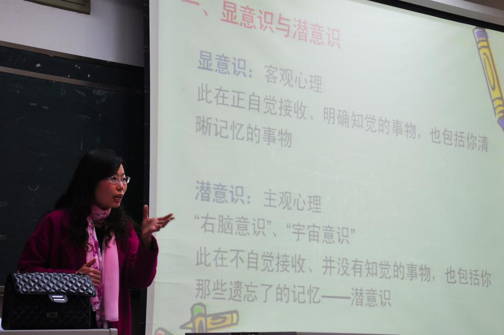 宋燕老师从柏拉图的哲学问题“我是谁,我从哪里来,我到哪里去”出发,以弗洛伊德的心理学说为核心,融入了自己的学术研究,深刻而生动地向在场同学们阐释了“显意识和潜意识”、“本我、自我、超我”以及“人格结构的斗争和自我防卫机制”这三个论题。心理学抽象晦涩,但宋老师旁征博引,循循善诱,化抽象为形象,直观地帮助同学们获知并理解了人的潜意识、人格结构以及自我防御等知识。如,潜意识是我们现实能量的3万倍以上。潜意识是自我真实身份的栖居之所,要想认识真正的自己,便要回归自己的潜意识。暗示是潜意识的最大影响者,暗示决定人的思想、行为和发展。本我、自我与超我就像人体中的三个小人,不断地冲突并引发个体焦虑。虽然人有自我保护功能,可以通过自我防御机制不断调节冲突以应对焦虑。但当自我比较脆弱时,焦虑将持续存在并会进一步诱发诸如嫉妒、强迫症等心理问题。人应在正确认识不良情绪及心理问题的基础上学会自我调节,始终保持良好心态,积极地面对人生。