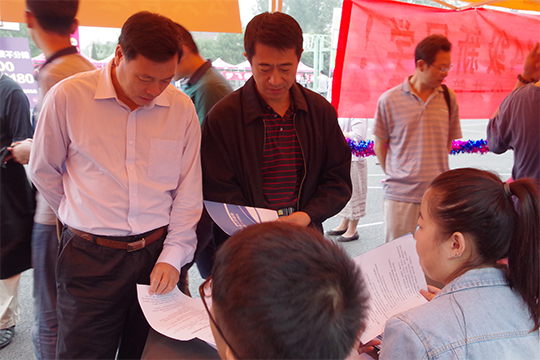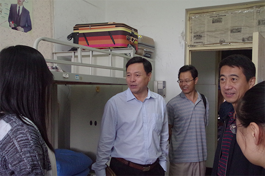 9月11日中午12点,我院14级迎新工作在明水校区篮球如火如荼的展开。9月12日上午9点,我院党委书记郑磊,副院长董西明,党委副书记周炎莅临迎新现场视察、指导迎新工作,向学生会干部了解新生的报到与安排工作,并与休息区的家长亲切交谈,给新生家长答疑解惑,解决他们的后顾之忧。随后,学院领导来到新生宿舍,询问他们对生活环境的感受,记录了同学们提出的疑难和问题,提醒他们注意宿舍安全,鼓励他们尽快熟悉学校环境和宿舍生活。