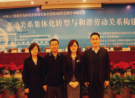 由中国人力资源开发研究会劳动关系分会主办,西南政法大学管理学院、西南政法大学劳动社会保障法制研究中心及西南政法大学人力资源管理与劳动法制研究中心承办的“劳动关系集体化转型与和谐劳动关系构建——中国人力资源开发研究会劳动关系分会第5届年会暨学术研讨会”于2012年11月24日-25日在重庆召开。我院张红凤院长应邀带队参会。