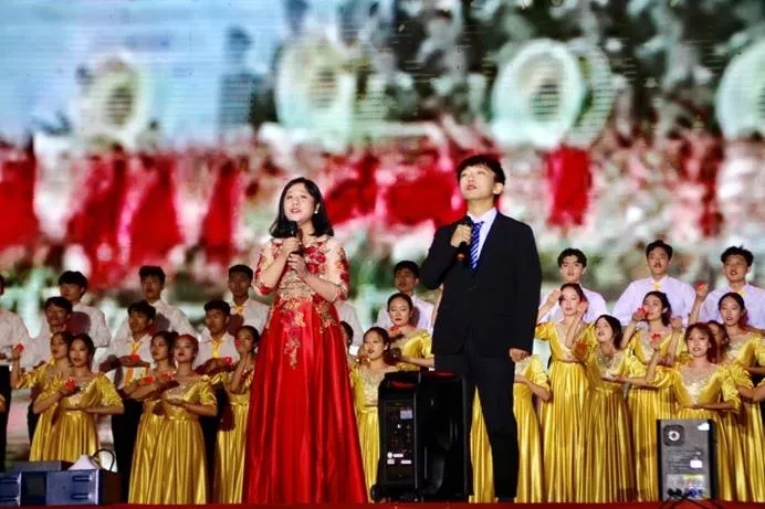 本次迎新晚会共分为三个篇章。我院主要节目——歌曲《天耀中华》于晚会第一篇章“祝福祖国,天耀中华”压轴出场,该曲目以合唱形式呈现,由我院党委副书记吕晓燕、大三学子李世童领衔主唱。合唱团全体成员由我院部分大二学生组成,分为合唱与手势舞两个表演部分。吕晓燕书记身着正红色刺绣礼裙,与领唱学生李世童所着西装交相辉映;合唱成员身着姜黄礼服,两侧手势舞成员则穿着形式多样的民族服装,手捧红烛,随歌声而舞。服装庄重大气、寓意深远,歌唱优美动听、配合默契,从视觉与听觉两方面给观众带来双重感官享受。