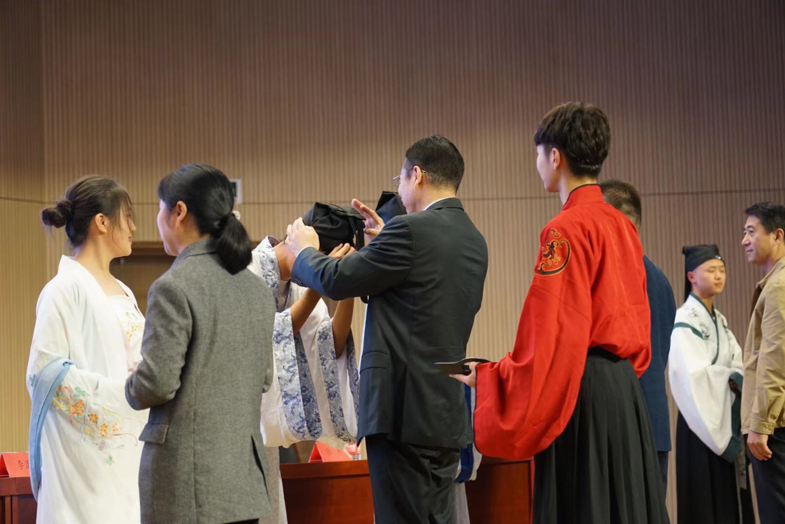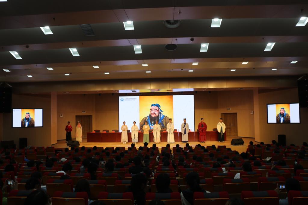 最后一项,举行新生成人礼。《左传》有云:“泱泱华夏,有礼仪之大,故称夏;有服章之美,谓之华。” 秉承中华民族优良传统,我院为新生精心准备了成人礼。在身着传统服饰的赞礼者的带领下,冠者笄者进行加冠礼与加笄礼,宣读誓言并三拜孔子像。本次成人礼不仅展示了礼的精神,更使初成年的大一新生明白自身所肩负的责任与使命。