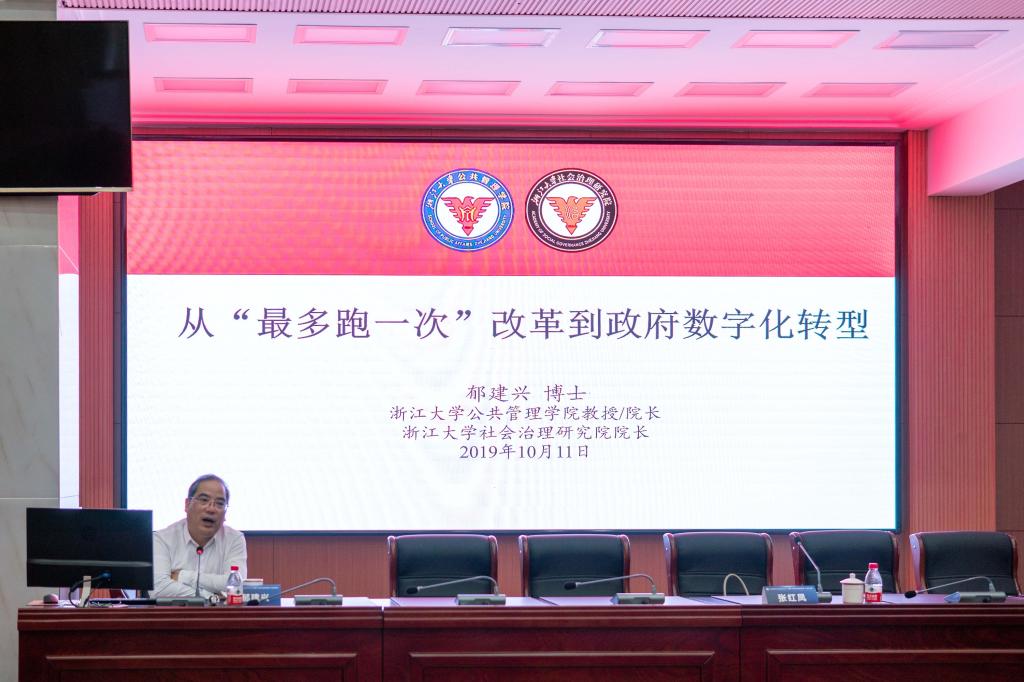 院长郁建兴教授发表主题为:从“最多跑一次”改革到政府数字化转型的演讲,他阐述了“最多跑一次”改革是践行“以人民为中心”发展思想的具体行动,是公共管理人追求深化改革的要求,通过政府数字化转型能够提供政府工作效率和服务水平。
