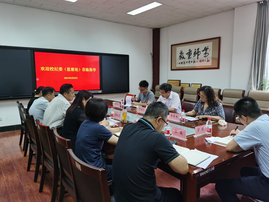 2021年6月25日上午,校纪委书记王福岱、纪委常务副书记、监察处处长李秀美、校纪委干部盛坤宇一行来我院调研党史学习教育开展情况和全面从严治党工作,全体班子成员参加了会议。