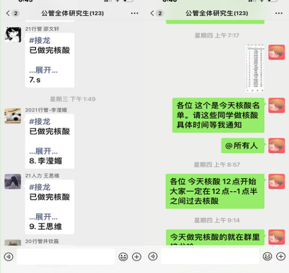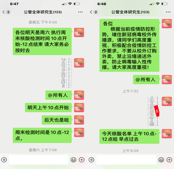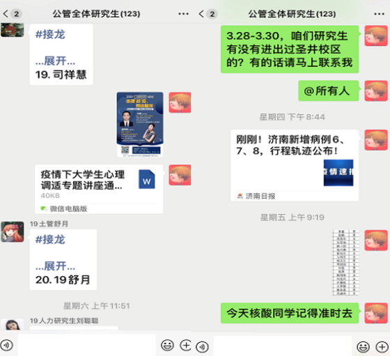 我院党委高度重视对研究生疫情防控的宣传工作,建立学院全体研究生疫情防控微信群,第一时间发布疫情防控工作通知、预防知识、学校党委的最新部署等内容,把疫情防控相关信息传达到每一个研究生。让研究生充分认识到当前疫情防控形势的严峻性,准确把握各级防控工作要求,筑牢抗击疫情的思想防线。研究生辅导员每天在群里提醒同学们按时去做核酸抽检,并在核酸抽检完毕后组织学生接龙。全面摸清、精准把控在校103位研究生的健康状况、思想状态、心理状态和行动轨迹。