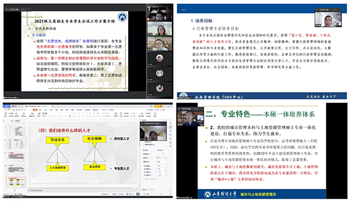 5月19日,学院面向2021级同学召开了大类招生专业学生分流工作说明会。党委副书记王坤主持会议。副院长罗微对《2021级大类招生专业学生分流工作实施细则》和《行政管理创新实验班管理办法》做了详细解读;政府管理系副主任邹涛、劳动与社会保障系主任徐宏、城市与土地管理系副主任韩琭分别对行政管理、劳动与社会保障、城市管理三个专业的人才培养特色、课程设置、就业和升学去向等做了全面介绍,并回答了同学们关心的问题。