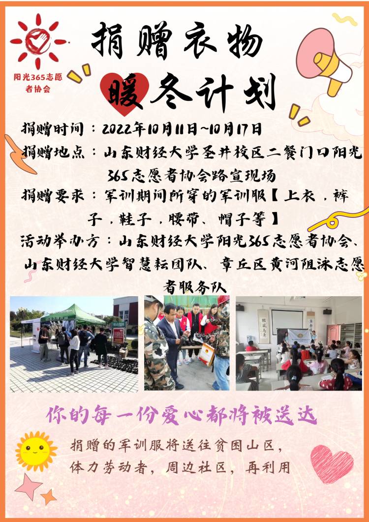 在学校与学院的大力支持下,我院社团阳光365志愿者协会于10月11日至17日在圣井校区、燕山校区成功举办军训闲置衣物捐赠活动。