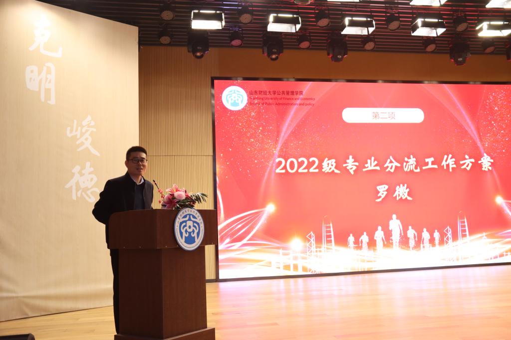 会议第二部分,由我院副院长罗微介绍2022级专业分流工作方案。分别说明了各专业预设分流人数,随后重点说明了我院分流录取依据,并强调了“志愿优先,成绩排名”的原则。此外,罗微副院长向公管学子介绍了创新实验班相关的教学管理事项,展现实验班管理与学习的特色,使各位同学对实验班的认识更加全面。随后,罗微副院长介绍了分流工作的日程安排和其他注意事项,并要求相关同学及时按照日程安排完成各项流程。