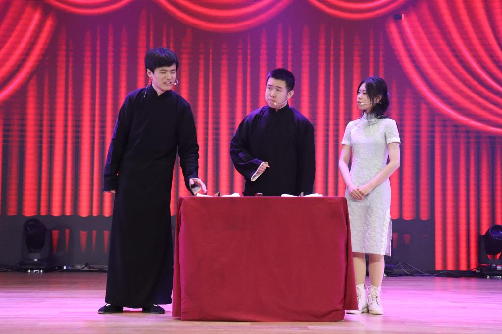 晚会来到第三章:春和。相声《双字意》,2022届优秀校友陈广昊与两个搭档一捧一逗,将我国国粹融汇进诙谐的逗趣中,生动有趣,现场欢声笑语不断;民族大联欢《美丽中国》,民族舞者们身着各具特色的民族服饰,在激昂澎湃的歌声中翩翩起舞,婀娜的身姿宛若一朵朵绚烂绽放的民族之花。最后,晚会在大合唱《相亲相爱》的亲切旋律中圆满落幕,演唱者们的歌声沉稳与奔放并存,传递给同学们希望与爱意。