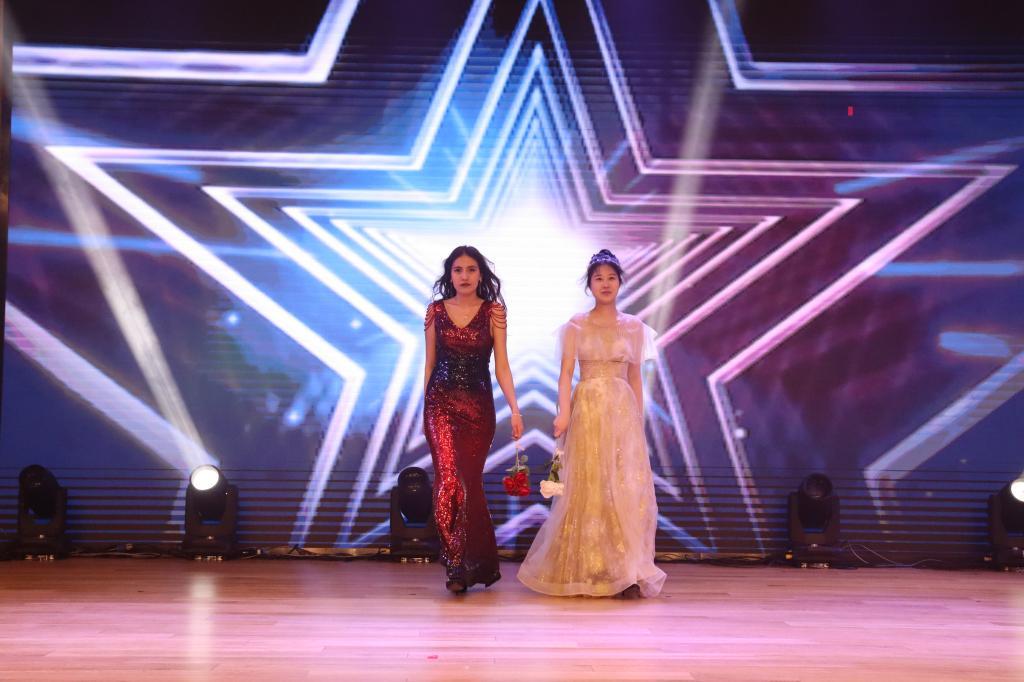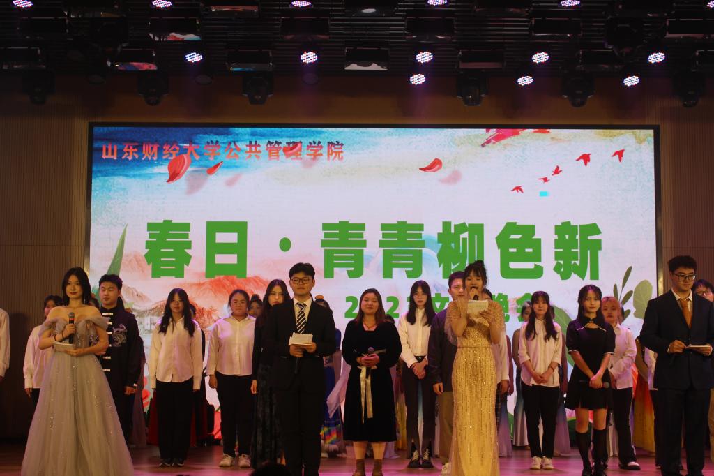 晚会进入第二章:春熙。研究生与本科同学带来的爵士舞蹈串烧《爱你》《what is love》《shut down》,各位舞者青春昂扬的舞姿引发全场阵阵喝彩;学生朗诵《青春礼赞新时代,峥嵘百年新征程》饱含敬意与激情,激励大家不做空想,不骛虚声,厚德笃志,守正创新;模特走秀《youth》将气氛带入高潮,男生女生们身着笔直的西装与华丽的礼服,步伐潇洒自信,神采飞扬,现场尖叫不断;师生合唱《带我去很远地方》以轻柔抒情的歌喉将梦想与自由倾注在音乐中、回荡在观众耳畔,展现了我院师生同心同德,共创美好的师生情谊和公管情怀。