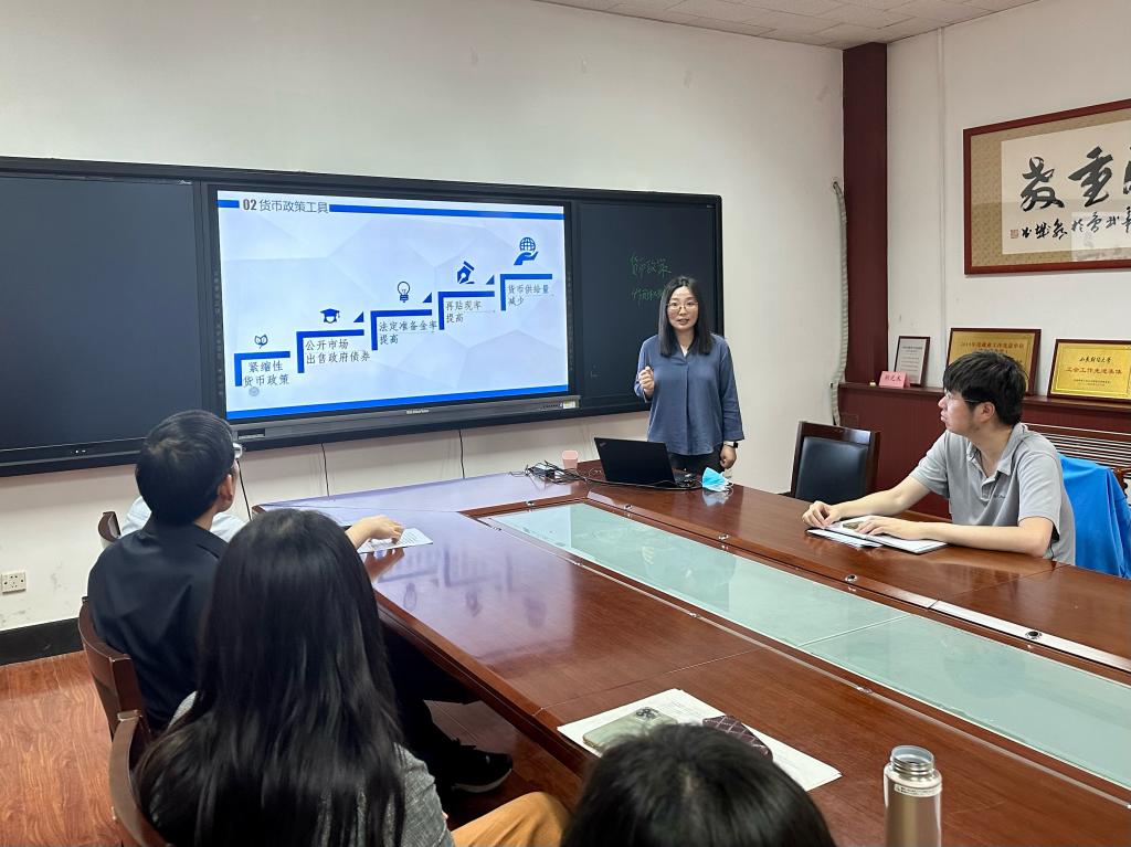 第二个环节是政府管理系副教授冯志艳的教学示范。冯志艳的授课主题是《货币政策工具》。首先,她和同学们一起进行了课前回顾,回顾了上一节财政政策的定义和工具,然后通过几个小案例自然地导入了本节课的学习主题;然后,利用现实生活中的实例,讲述了政府债券、法定准备金率、再贴现率等货币政策工具的定义和作用,增加了课堂的趣味性和互动性;最后,进行了课堂总结,加深了同学们对本节课知识点的印象。其准备充分,教学内容丰富,教学方法灵活,展示了较高的专业水平和教学能力。