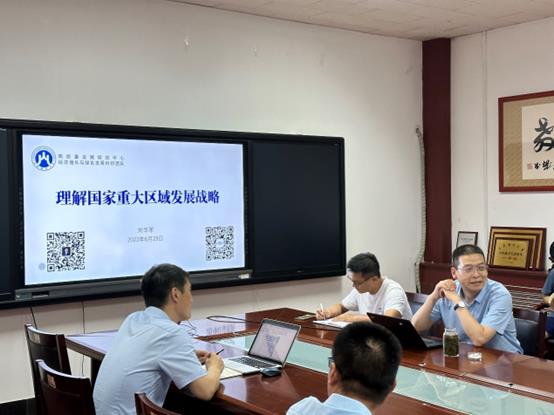 其次,刘华军教授带领师生们学习了党的二十大关于国家重大区域发展战略的论述,并从战略维度、创新维度和问题导向维度三个方面去理解与把握国家重大区域发展战略。他多次引用习近平总书记在会议与报告中的发言,引导教师和学生去思考其中的内涵与精髓,去体会总书记作为“国之大者”的胸怀和远见。