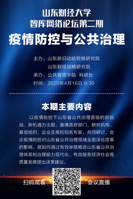 CQ9电子 智库网络论坛第二期预告 发布时间:2020-04-15 10:18 浏览 次 题 目:疫情防控与公共治理 主 办:山东新旧动能转换研究院 山东财经战略研究院 承 办:CQ9电子 CQ9电子 科研处 时 间:2020年4月16日上午9:30 主 持 人:张红凤 致 辞 人:赵忠秀 本期主要内容: 以疫情防控下山东省公共治理面临的新挑战、新机遇为主题,邀请政府部门、研究机构、基层组织、企业及高校知名专家,共同研讨、会诊疫情防控对山东省公共治理领域全面深化改革的影响,就如何通过有效举措推进山东省公共治理体系和治理能力现代化、有效服务经济社会高质量发展提出决策建议。 专家介绍: