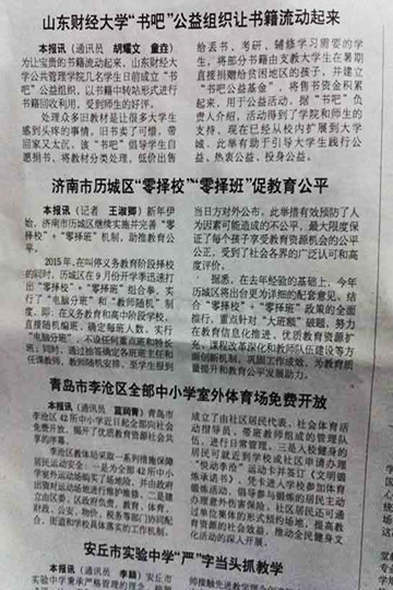 “书吧”社团公益组织,该社团通过书籍中转的形式,通过在校学生的无偿捐赠和收集毕业生遗弃书籍,实现回收再利用,由支教大学生在暑期捐赠给贫困地区的孩子,并建立公益基金将售书资金积累起来,用于公益活动。此项活动自开展以来,得到了社会各界及学校师生的广泛关注,近日,《山东教育报》对我院“书吧”活动进行了专门报道。学院也十分重视读书活动,今年寒假专门安排明水校区的学生,每人读三本书,并写出至少两篇读书心得。