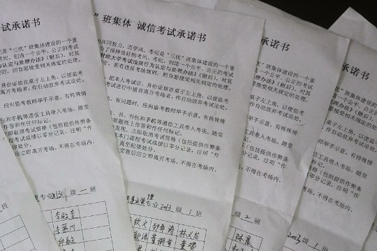 张辉老师向大家传达了学校加强考风考纪建设的有关精神,布置了期末考试的各项具体工作,告诫同学们在考试中要严肃考风考纪,杜绝一切作弊行为。会后,各班学生干部纷纷带头在诚信考试承诺书上签上自己的名字。