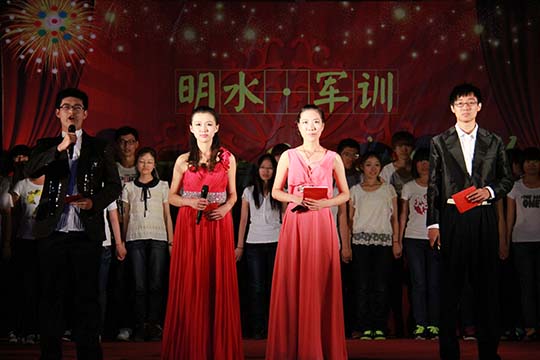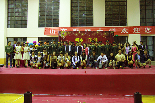 “金秋十月,欢歌笑语”10月20日晚,我院与国际交流学院共同举办的2013级军训联欢晚会在明水体育馆隆重举行。学院党总支书记王有志、党总支副书记周炎、辅导员张辉,国际交流学院党总支副书记张红艳、辅导员王坤,军训团五营八名教官以及两个学院的800多名新生参加了本次晚会。