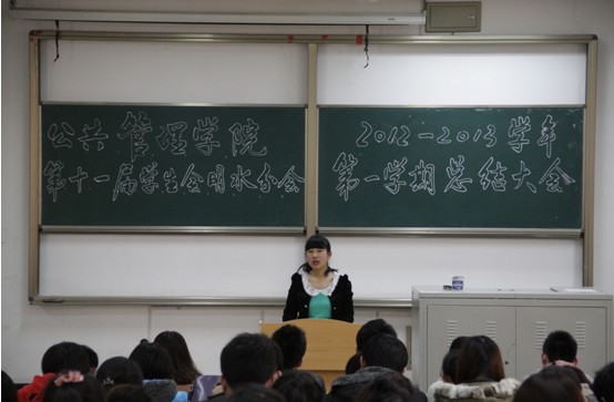 第十一届学生会明水分会2012—2013学年第一学期总结大会在明水3101教室举行。学生会主席团、各部部长、副部长、干事出席了本次大会。会议由秘书长姜婷主持。