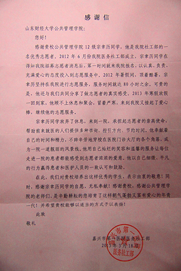 我院2012级学生宗聿历,是嘉兴市第一医院医务社工部的一名优秀志愿者。自2012年6月嘉兴市第一医院社工部成立以来,宗聿历同学一直以认真、负责、充满爱心的态度进行志愿者服务。无论是炎热的暑假,还是寒冷的寒假,宗聿历同学只要一回到家,就会继续他的志愿服务。他用放假休息的时间来到医院,不辞辛劳的服务在医院的每一个角落,感动着每一位患者和医护人员。为此,嘉兴市第一医院医务社工部特别向我院发来感谢信,感谢宗聿历同学的无私奉献,感谢我院培养出如此优秀的学生。