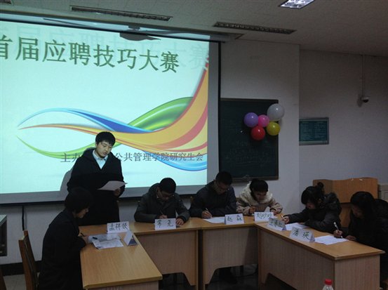 主办,研究生会承办的“首届应聘技巧大赛决赛”正式举行,来自山东浪潮集团人力资源部的宋宏伟、鲁银投资集团的经济师李乐以及山东航空人力资源专家赵永军和鲁商集团的刘朝立担任了本次大赛的评委,参赛报名人员面向学校的全体研究生。