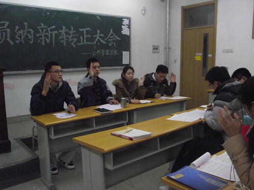 在纳新环节,发展对象郑重宣读入党申请书,由入党介绍人介绍其在校表现情况和个人意见。经过严格的程序,由辅导员老师宣布支部决议,同意宋睿、刘珍君等49名同学正式成为中共预备党员。之后,考察期满一年的预备党员向组织提出转为中共正式党员的申请,并汇报了一年中自己的思想及工作情况,表达了自己积极向党组织靠拢的意愿,支部正式党员对本次预备党员的转正情况进行举手表决,同意肖宇洁、王志聪等27名预备党员正式成为中共党员。