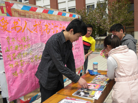 “蒙山高,沂水长,沂蒙山区好地方”,随着思想的解放,临沂的经济实现又好又快的发展,然而,在临沂经济快速发展的同时,仍然有一些贫困的地区,交通闭塞,基础设施不完善,教育资源落后,人民的思想不能与时俱进,这样艰难的处境令在校大学生动容。“书香传情,奉献爱心”,山财大学子积极热情,捐书现场气氛火爆。你一摞,我一捆,大家纷纷捧来自己的爱心读物,献出自己的爱心,为山区孩子撑起一片蔚蓝的天空。当一摞又一摞的书本高高堆起,同学们的脸上都露出了欣慰的笑容,同时标志着本次为沂蒙山区捐书活动的圆满成功。