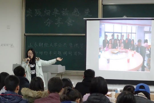 分享会由实践创新部副部长张耀政主持,他首先向同学们介绍了学校暑期社会实践活动“三千计划”的具体内容。随后,李恺鑫介绍了“城风团队”对济南网约车问题的调研情况,利用视频展示了“城风团队”整个社会实践过程,并围绕着“济南网约车问题”讲解了调研团队跟随网约车调研过程中遇到的困难和经历感受,阐述了实践活动的意义,分享了成员们集体合作的快乐。闫梦真和姜冲分别介绍了团队对“阳信县精准扶贫项目绩效”、“烟台市农村饮用水安全问题”的调研的情况,与同学们分享了调研过程中为克服语言障碍、居住问题所做出的努力以及村民们对调研活动的支持所感受到的温暖。三位队长通过精心制作的PPT课件,向同学们详细的讲解了组建队伍、确定课题、立项策划、实地调研、导师指导、调研报告的撰写等实践调研过程。分享了实践活动中的收获,通过自身体验向新生们提出了改进意见和建议。活动最后,我院学生会副主席庄众心作了归纳总结,讲明了社会实践活动对大学生学习、生活和工作上的促进作用。