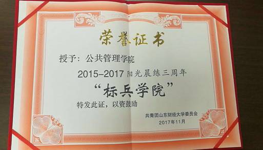 (通讯员 王超)在学校组织阳光晨练开展三周年之际,为进一步贯彻阳光体育运动理念,表彰晨练先进集体,树立模范典型,推动学校阳光晨练工作更好开展,学校团委于11月9日在燕山校区召开总结表彰大会,对组织开展阳光晨练活动好的学院进行了通报表彰,我院荣获阳光晨练三周年“标兵学院”荣誉称号。