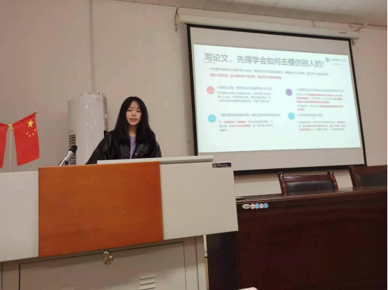 刘敏从自身发表的论文与主持(参与)课题经验出发,讲述了论文写作与发表的方法与经验。她从文献选择、文献阅读、论文选题、写作方法四个方面梳理了一篇论文的产生过程,并提出要重视优秀文献的写作范式与研究方法,即使研究领域不同,也可作为借鉴。她还重点强调研一新生选题不要一味求新,要量力而行。最后,刘敏同学提出在研究过程中一定要求真务实,要多看、多问、多思考、多讨论。