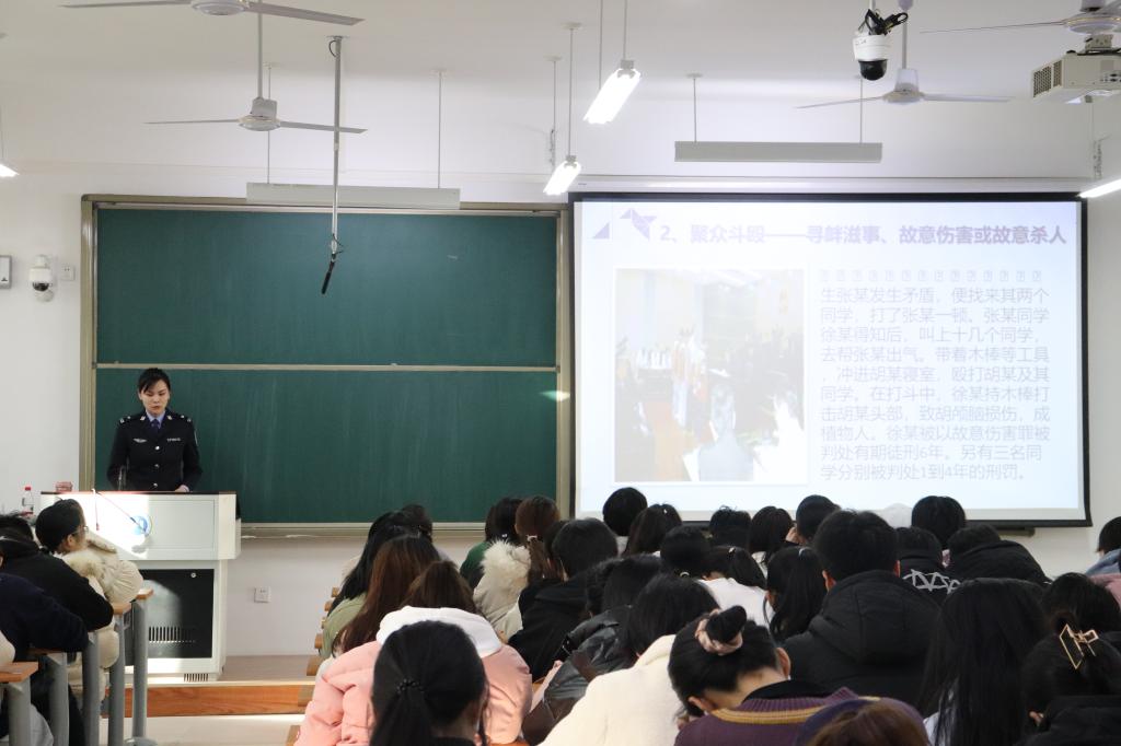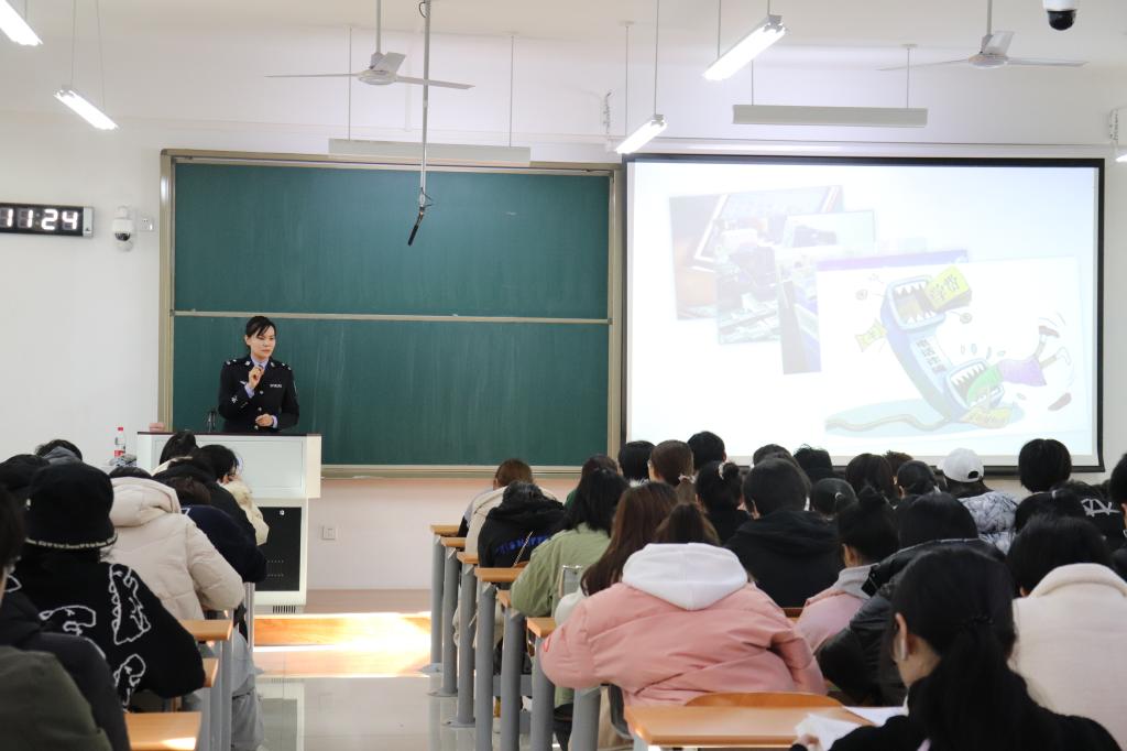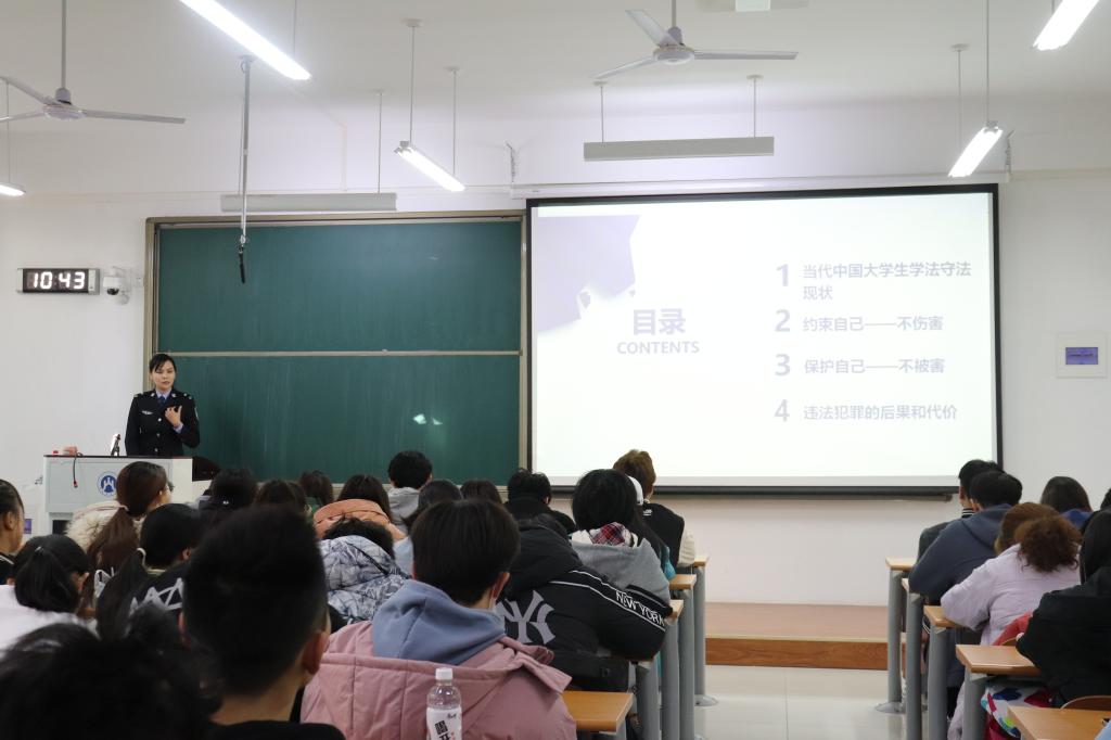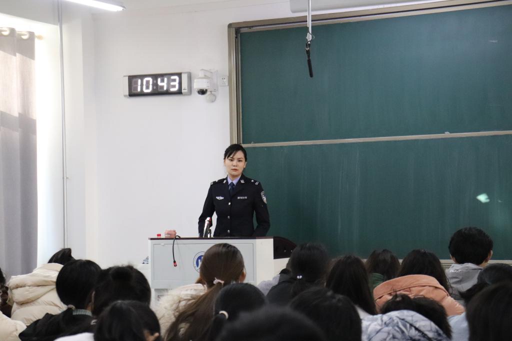 第三部分于科长通过防范毒品犯罪、防范电信诈骗、防范人身安全三部分向同学们提供了如何保护自己不被侵害。要提高自身防范意识,做好预防。保障自身财产安全,谨防各类电信诈骗手段。做到抵制校园暴力,防范性骚扰和性侵害,保护自己不成为被害人。