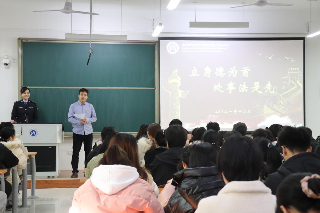 此次讲座邀请到山东省第二女子监狱于子涵科长,围绕法制宣传主题,普及知法、守法的重要性。于子涵科长是山东大学法律硕士,山东省监狱管理局授课专家库成员,山东省讲师团成员。讲座由2021级本科辅导员、学工办主任张辉主持,2021级学生代表参加。