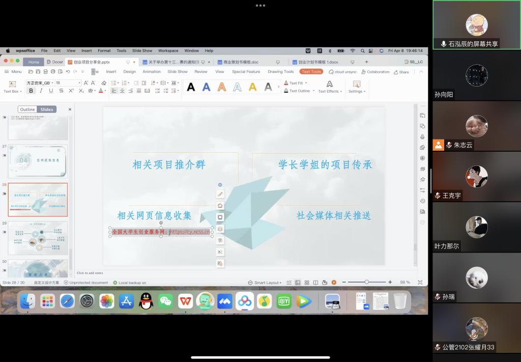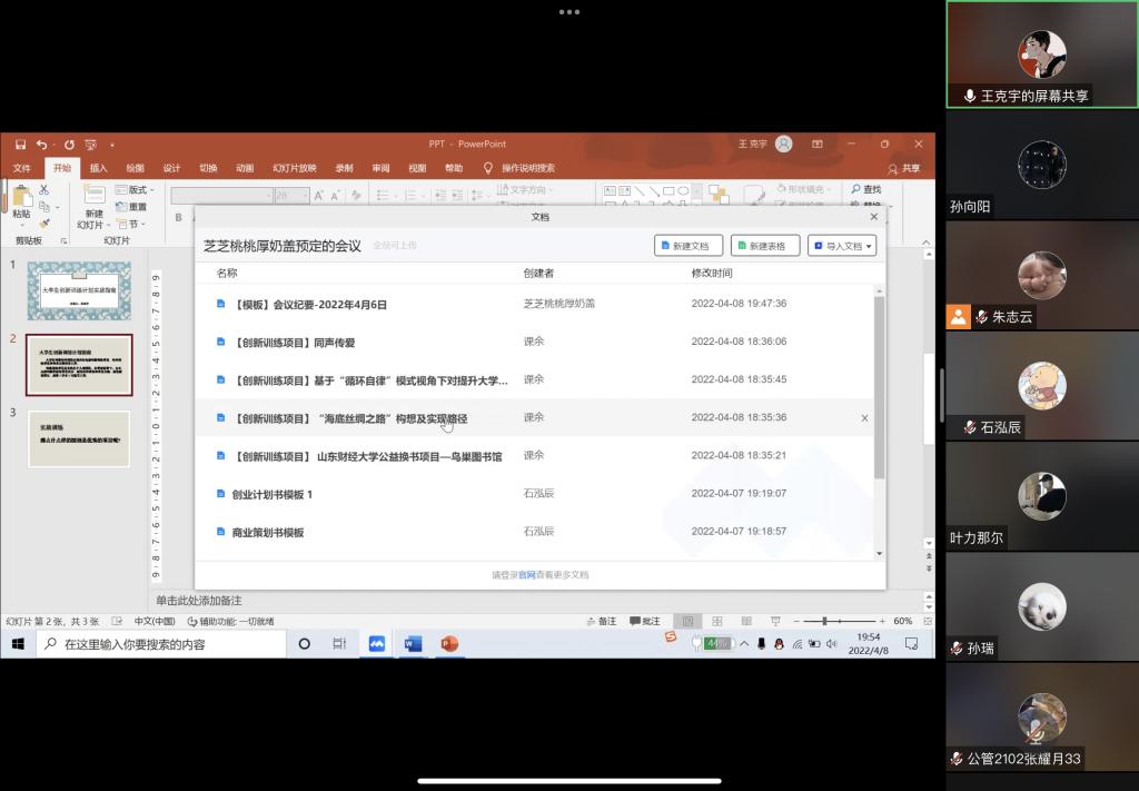 (通讯员 孙向阳)为深化高等教育综合改革成效,激发大学生创新创业能力,4月8日晚7点,我院通过腾讯会议向全院本科学生召开国创分享交流会,会议由科创部部长朱志云主持,劳动与社会保障1901班石泓辰、王克宇主讲。