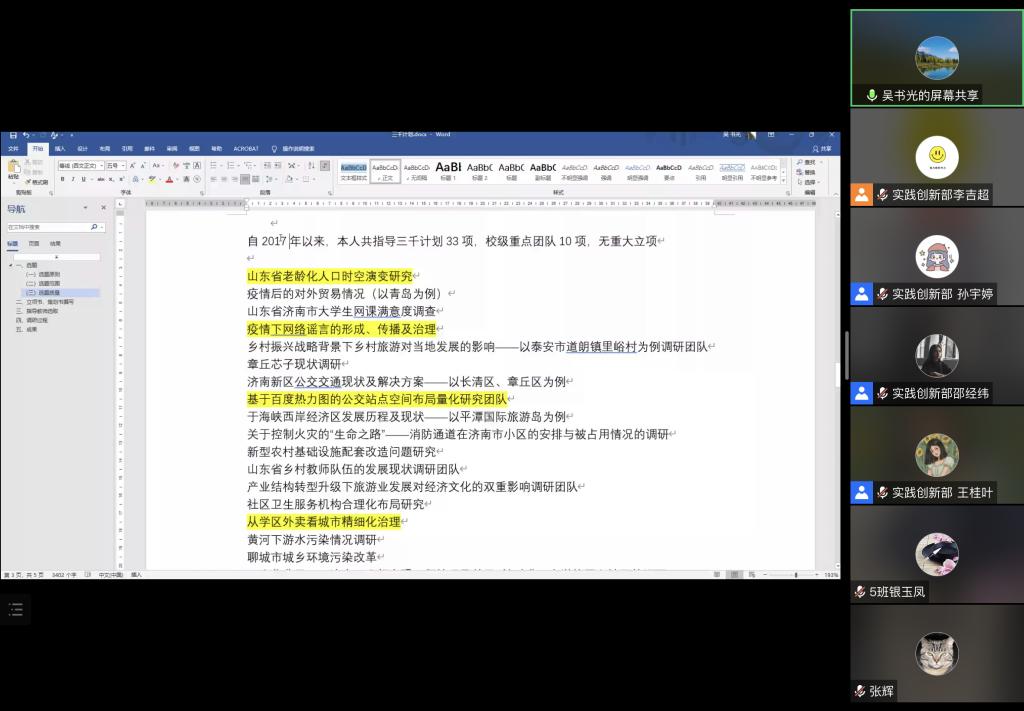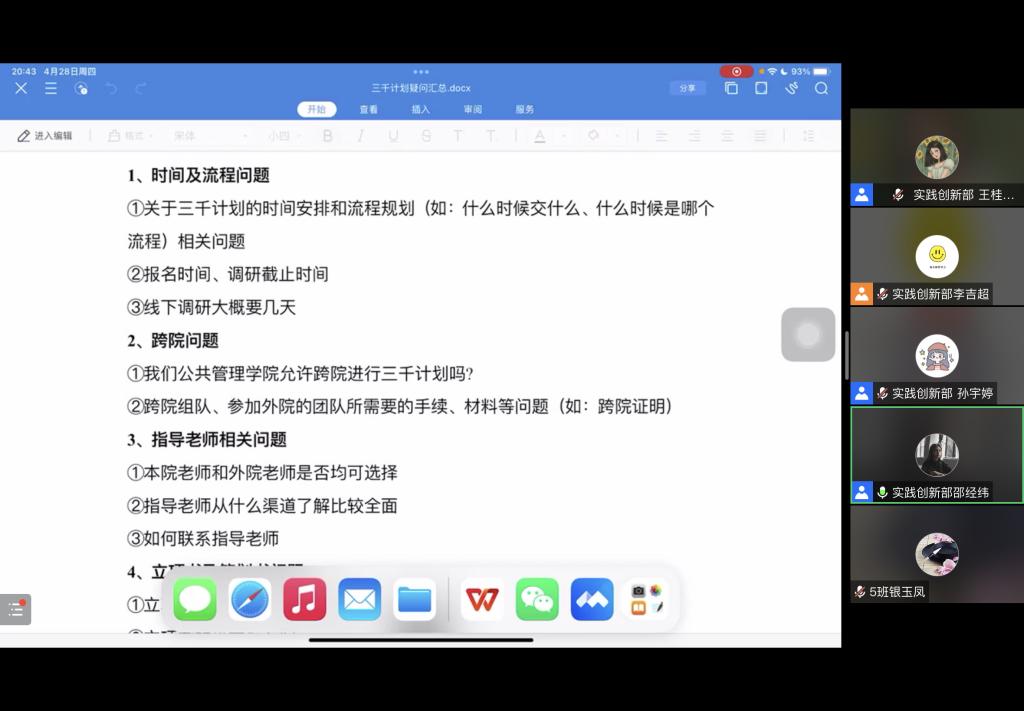 (通讯员 孙向阳)4月28日晚7点,我院实践创新部通过腾讯会议成功举办“三千计划”答疑会,会议由2021级辅导员张辉主持,城市管理教研室教师吴书光与实践创新部副部长李吉超、邵经纬主讲,我院2021级全体学生参加。