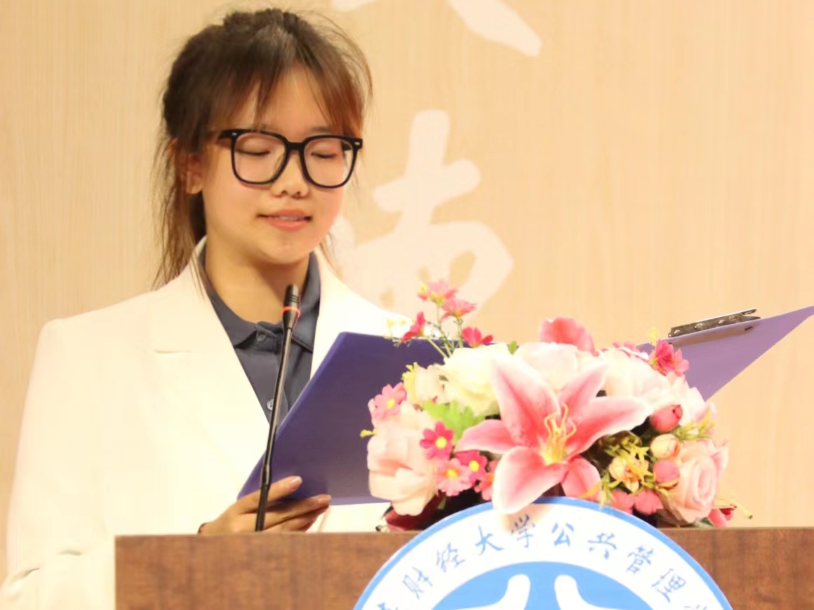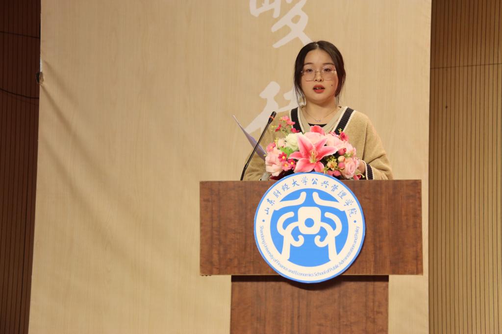 第十届学生会主席李婷婷发言。她以“活在当下,不负韶华,行你所行,爱你所爱”为主题,表达了对学生会工作的负责与热爱、对新加入学生会的同学的欢迎、对学生会未来发展的美好祝愿。