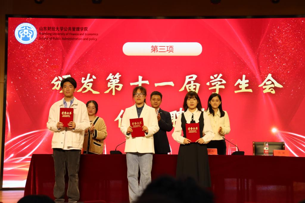 2022级辅导员张志斌宣读第十一届学生会任职名单。在激昂的音乐声中,张辉老师、张志斌老师、李婷婷同学和闫婕同学向第十一届学生会主席团成员和各部门部长颁发第十一届学生会任职聘书。