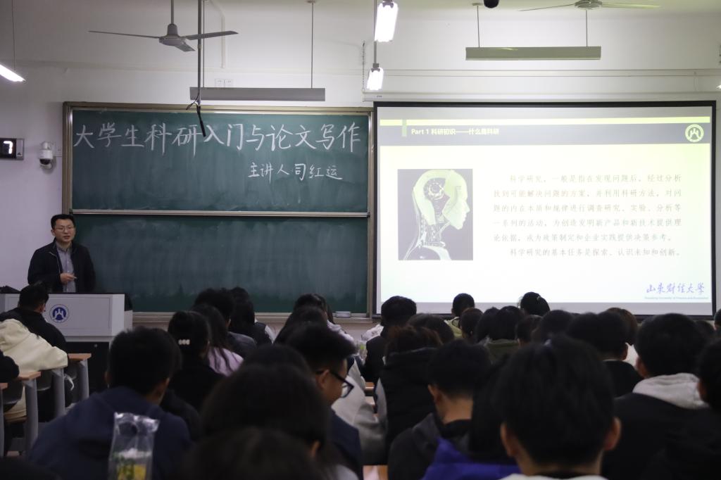司红运从“科研认识”“科研入门”“论文撰写”“论文发表”四个方面向同学们强调了科学研究的重要性。司红运表示,科研的本质是探索、认识未知和创新,认为同学们“不但可以,而且可以做得很好”。