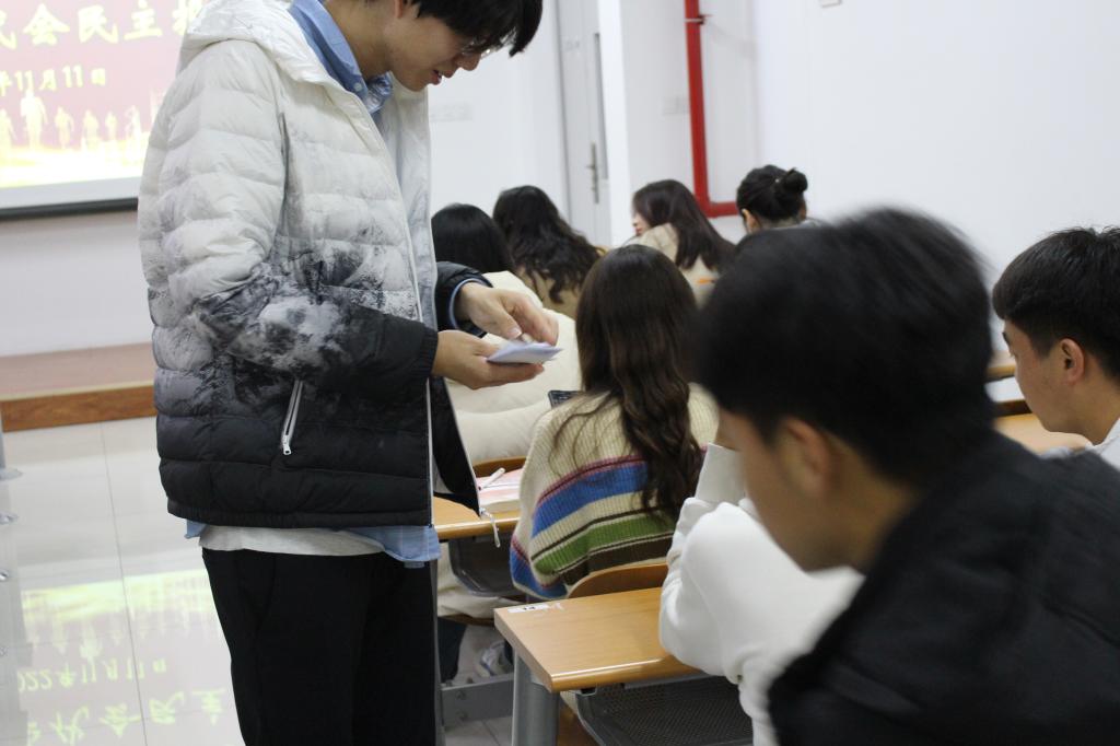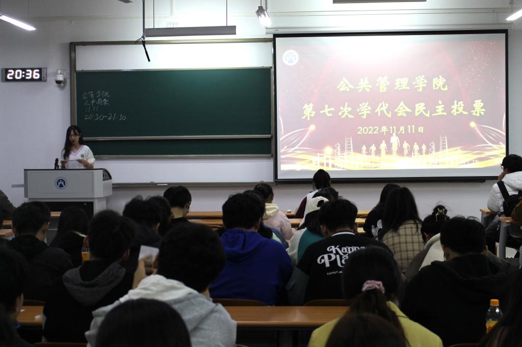 (通讯员徐施宁摄影田怡帆)11月11日晚,我院第七次学代会民主投票大会于圣井校区8112教室顺利举行,大会由我院学生会主席团成员陈佳凝主持,20、21、22级各班代表参会。