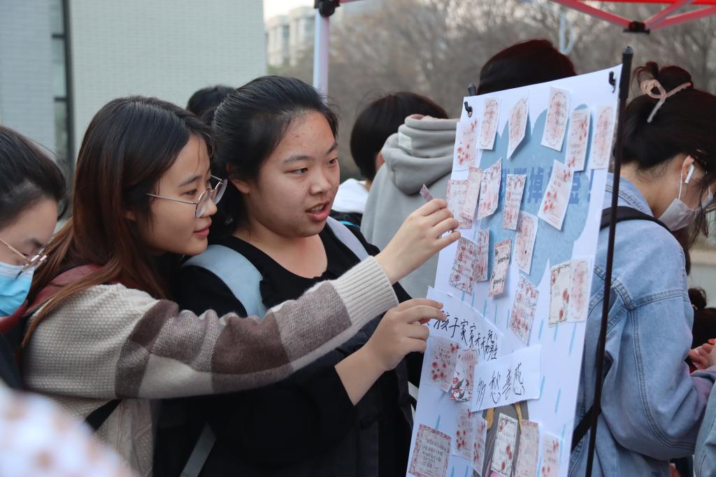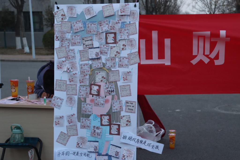 活动中,女生部干事们在准备好的立牌上贴上对女生不友好的标签,由参与活动的同学撕掉并写上自己的祝福,参与活动的同学可以获得贺卡和小礼物。活动现场热闹非凡,也吸引了更多的同学加入到这场活动中,现场也有许多男生前来参与,活动立牌上贴上了越来越多的便签,字里行间是大家对女生的祝福和鼓励。