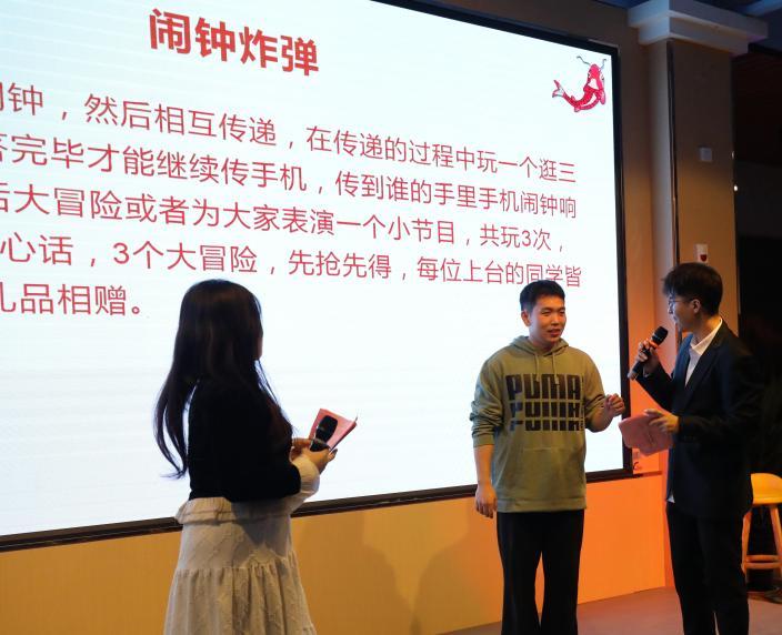 除了精彩绝伦的节目表演外,各个环节中还穿插了各种小游戏,比如你说我猜、切切乐、闹钟炸弹等,多位幸运观众获得了由研会外联部联系赞助商所提供的如优惠券、饮品等一系列丰厚的奖品。