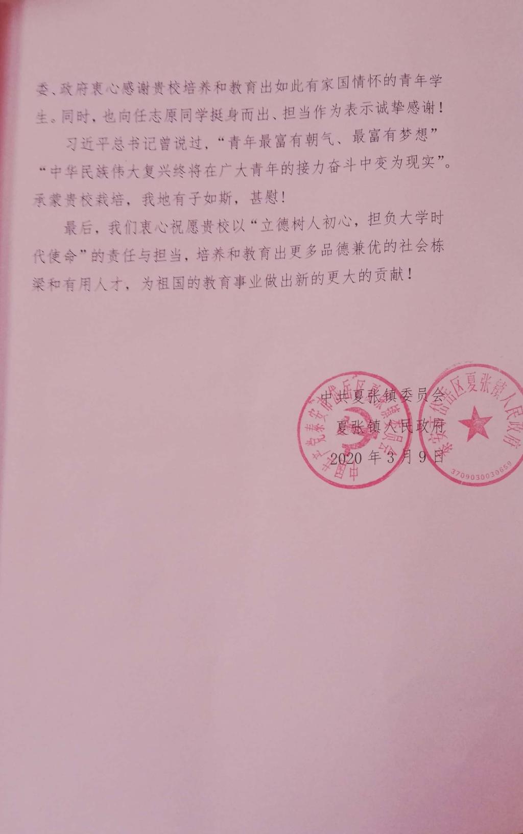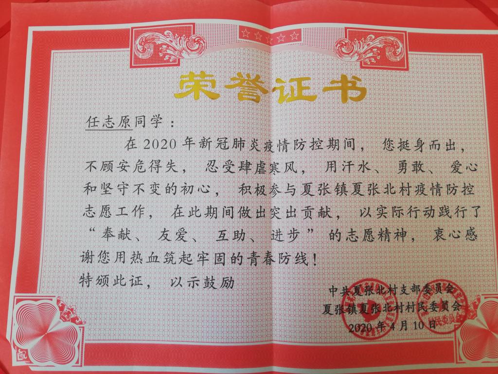任志原身为夏北防疫志愿服务队的队长,他身先士卒,为其他队员做出榜样,并且积极完成身为队长的工作,主持安排每日疫情防治工作任务的安排和各种通知的下达,让防疫期间的各项工作有序进行。防疫期间,他又领导全体大学生志愿者拍摄抗议宣传视频,并取得优秀成绩,又带领志愿者慰问夏张北村贫困户和环卫工人,引起积极的社会反响,让夏北大学生志愿者成为夏北防疫站点一份别样的风景线。