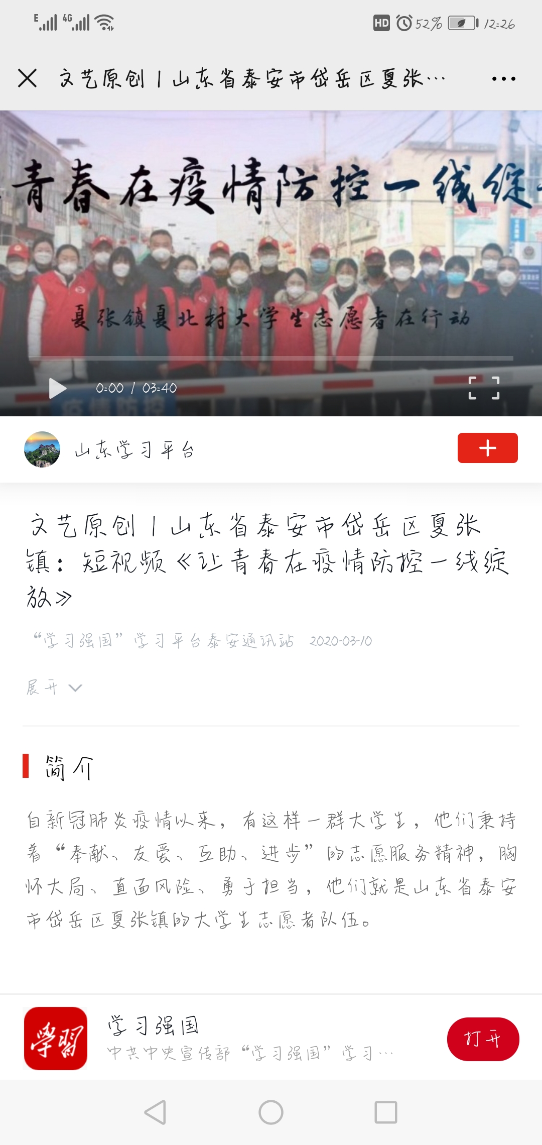 任志原通过媒体让他的实际行动为社会发声,展现新时代青年担当。他先后撰写抗疫感想和组织拍摄夏北大学生志愿者抗疫视频,都成功发表在学习强国平台。现今他已经带领他的队伍获得市级、区级、镇级优秀志愿者团队,他个人也获得市级优秀志愿者提名,并正在评选。