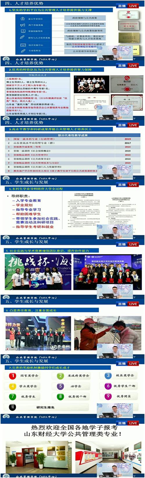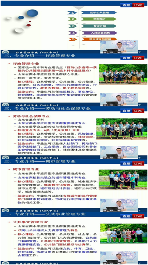 ”为主题,从“初识公共管理”“学院简介”“专业介绍”“人才培养优势”“学生成长与发展”五个方面向广大考生及家长介绍了我院的相关情况。结合专业建设标志性成果、特色课程设置、学生就业去向对我院四个本科专业进行了介绍;围绕坚实的学科平台、优秀的师资队伍、高水平教学和科研成果、多主体协同培养四个方面讲解了我院的人才培养优势;从学业导师制、大类招生、公共管理大讲堂、学生活动、社会实践与学术竞赛、责任教育、学业激励机制、就业(升学)渠道等方面全面、生动、客观地描绘了同学们在我院学习、成长的美好前景。