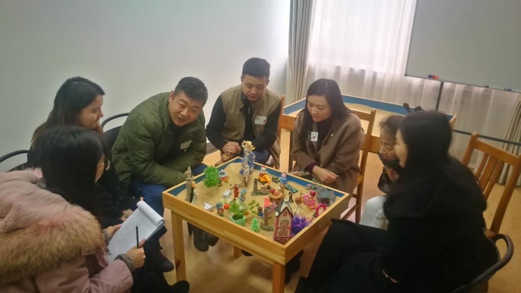 讲座结束后,盛明明老师理论结合实际,邀请我院学生工作团队共同参与沙盘活动。一粒沙是一个世界,反映着智者的思考和智慧,沙盘中展现出美妙的心灵花园,则是沙盘游戏治疗的生动意境。团体沙盘活动使成员在游戏中有效宣泄消极情绪、释放压力。同时,也促进了团体协作能力、团体凝聚力。