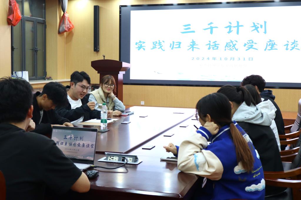 (通讯员 李燕梅 摄影 余添琪 李小茹)为加深同学们对“三千计划”社会实践活动的了解,激发同学们对参与实践的热情,10月31日晚,学院在圣井校区8-128会议室开展了“实践归来话感受”主题分享会,此次座谈会由学院学生会实践创新部主持,五支团队分别进行社会实践经验的交流与分享。