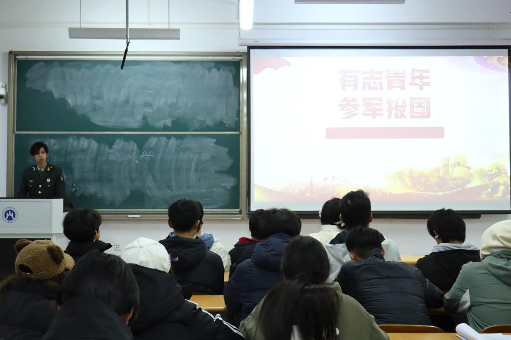 宣讲会伊始,退伍学长廖林豪以亲身经历为蓝本,向同学们详细介绍了大学生应征入伍的体检要求、入伍流程及国家给予大学生入伍的优惠政策,助力同学们全面了解参军优势。随后,廖林豪通过播放视频资料等形式生动展现了部队生活的真实面貌,并分享了入伍后的个人成长经历与部队发展前景,生动展现了从普通学生到优秀军人的蜕变历程,让同学们感受到了军旅生涯的独特魅力与重大意义。学院征兵工作辅导员、各班班干部也将在会后向同学们传达征兵信息,推动更多有志青年响应国家号召,投身军旅,为国防事业贡献青春力量。